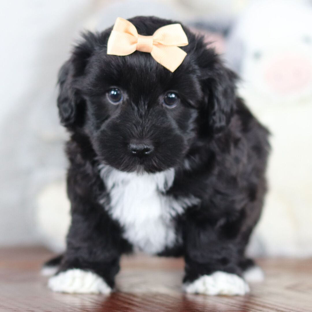 Mist is an adorable 4-week-old female Yorkie puppy with a fluffy black coat and white chest and paws. She has a sweet, curious personality and loves to snuggle. Mist is fully vaccinated, microchipped, and ready for her forever home.