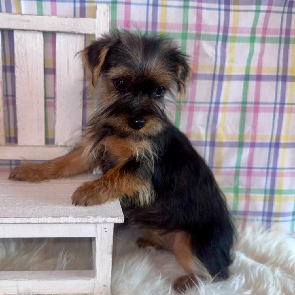 Amber is an adorable 17-week-old female Yorkie puppy with a fluffy black and tan coat. She has a sweet, curious personality and loves to snuggle. Amber is fully vaccinated, microchipped, and ready for her forever home.