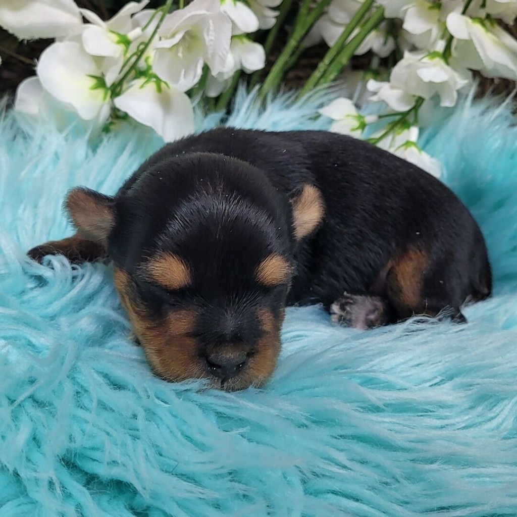 Bit is an adorable 3-week-old male Yorkie with a striking black and gold coat. He is very young and sweet. Bit will be ready for his forever home by May 16. He comes with a health guarantee and will be fully vaccinated and microchipped before going home.